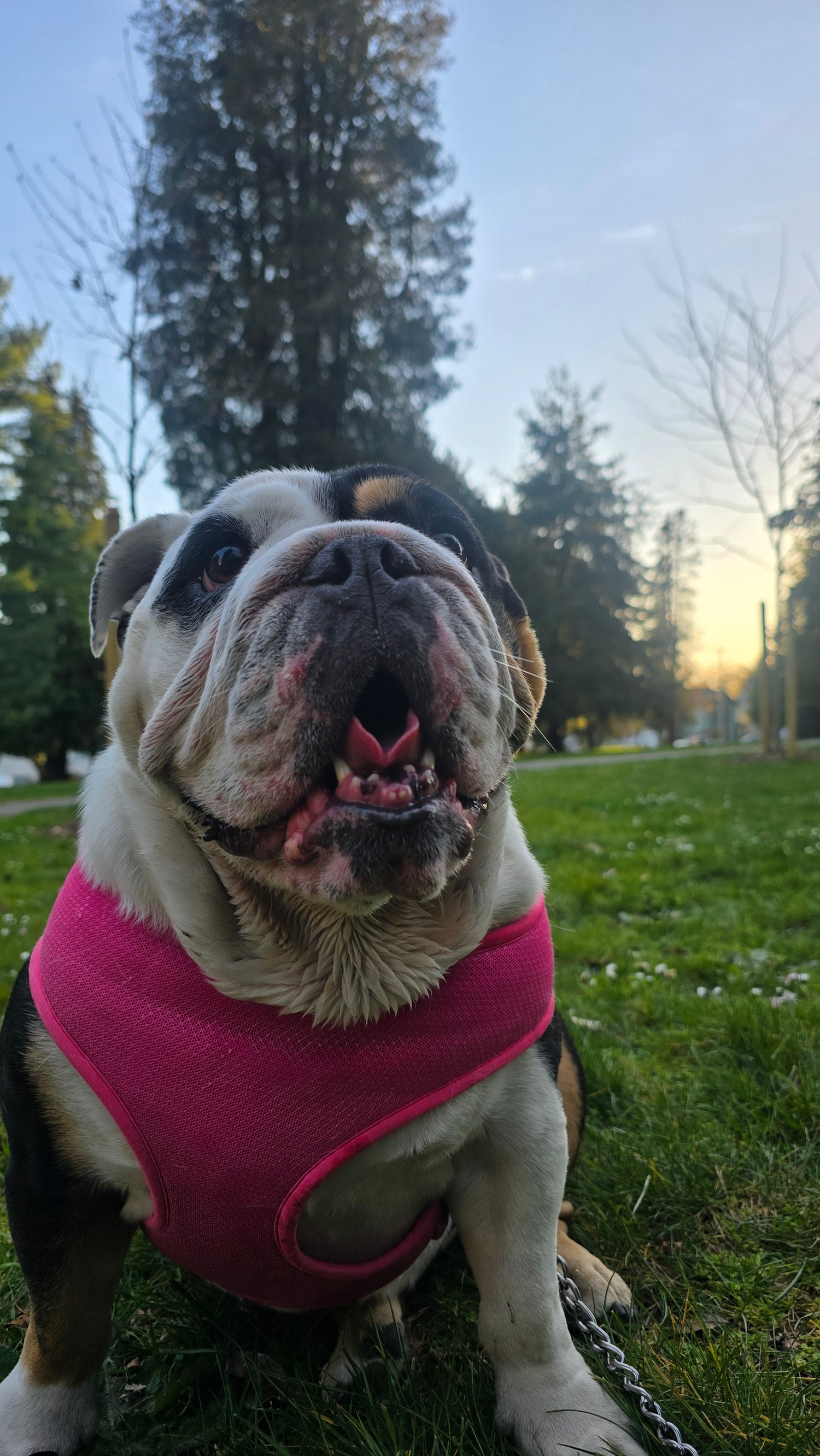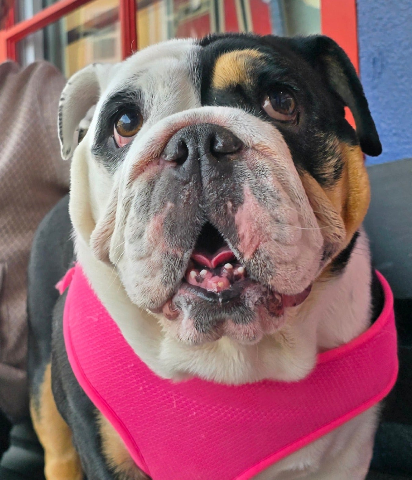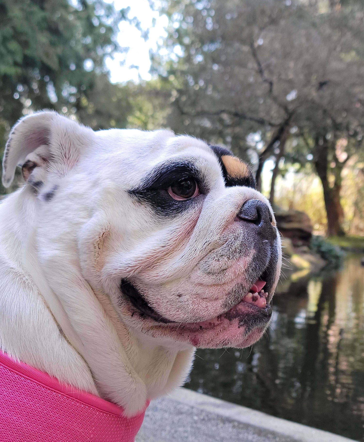 Picture is taken in daylight, eye level with the subject, and the pet has a happy expression.