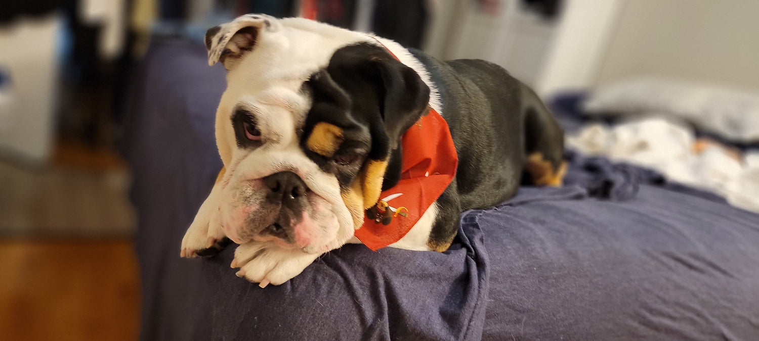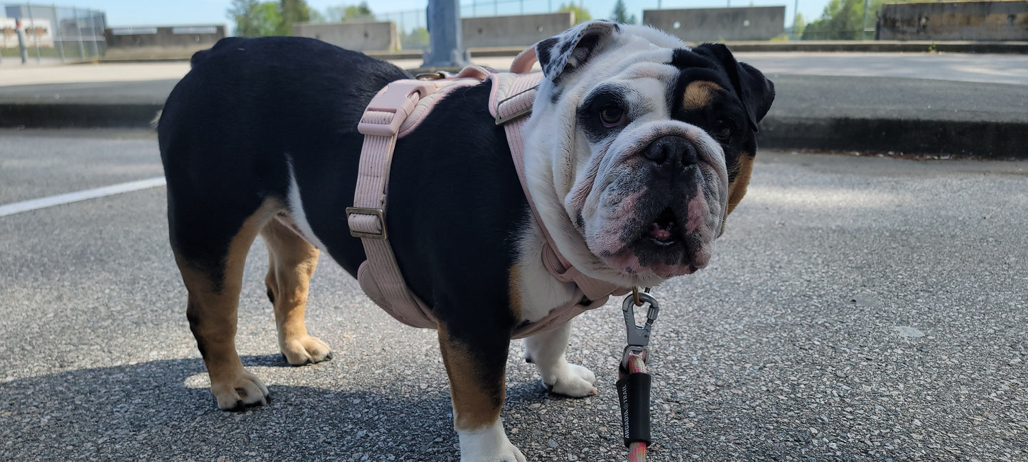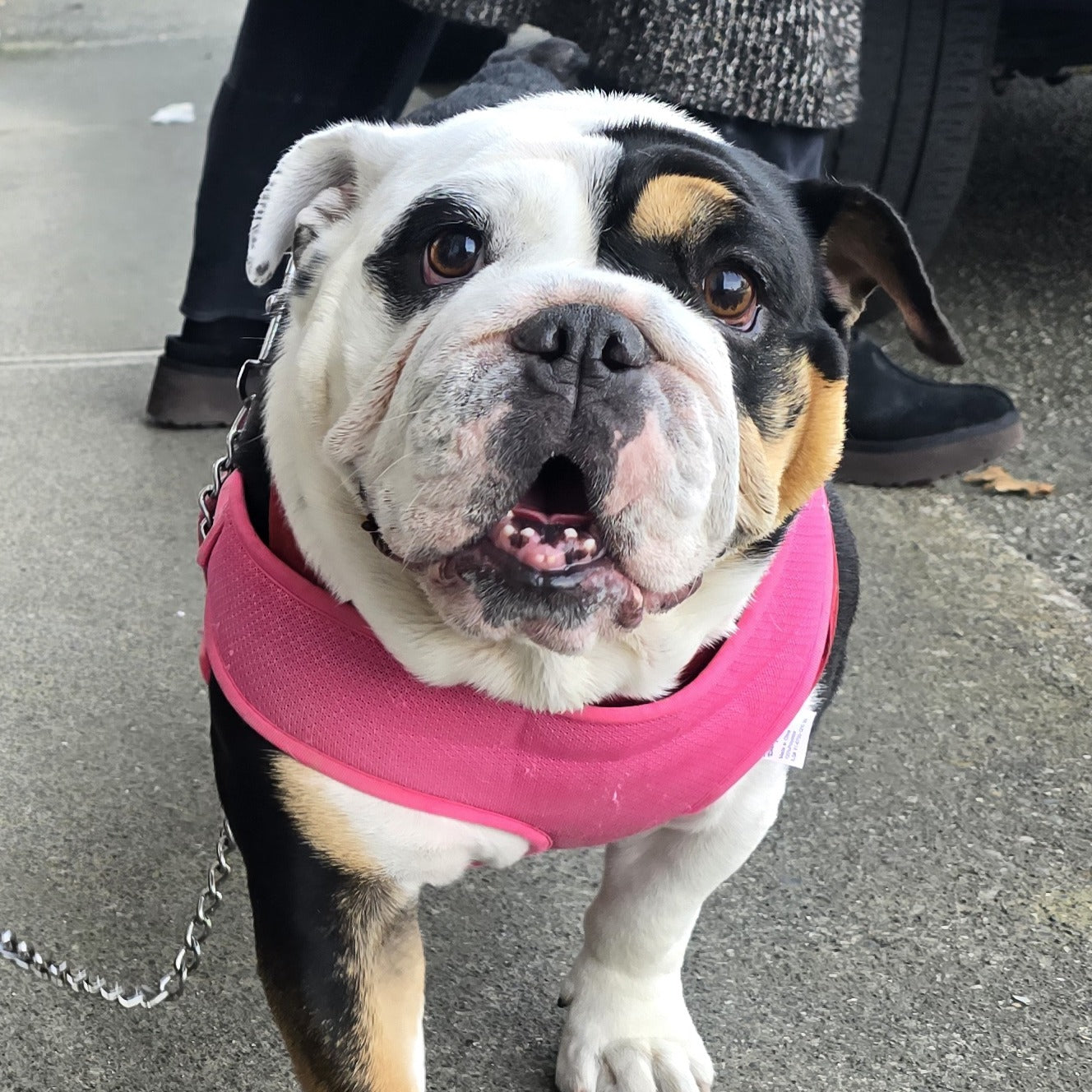 Picture is taken in daylight, eye level with the subject, and the pet has a happy expression.